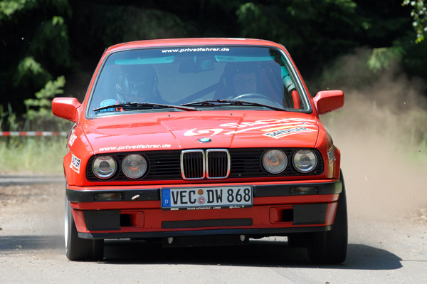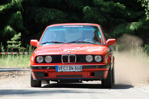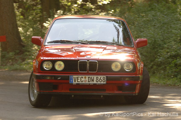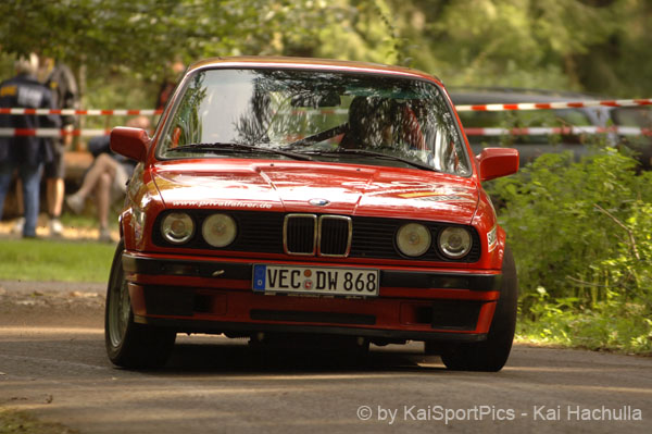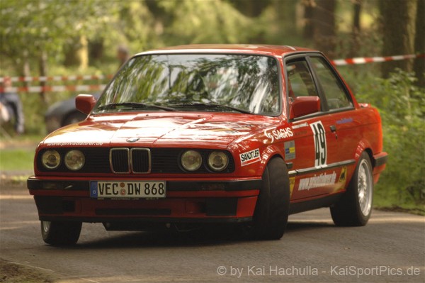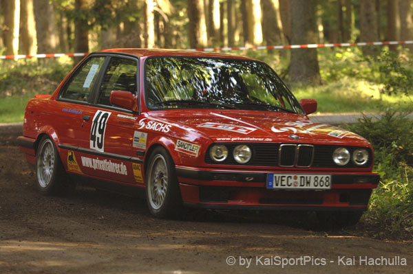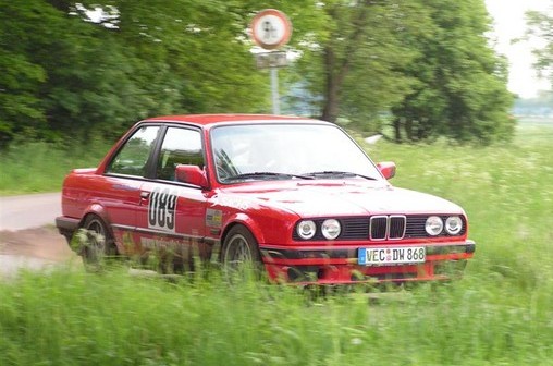 01.08.2006 - Bilder Unter "Galerie" gibt es einige neue Nahaufnahmen. 03.07.2006 - Visselfahrt / Rallye Buten un´ Binnen Am letzten Samstag waren wir gleich bei zwei Rallyes am Start. Morgens lief die Visselfahrt, nachmittags die Rallye Buten un´ Binnen. Start und Ziel war jeweils beim hübsch gelegenen Hotel-Restaurant Schweizerlust in Liebenau, die Wertungsprüfungen wurden auf dem nahe gelegenen IVG-Gelände durchgeführt. Beide Rallyes hatten diverse Prädikate, waren beispielsweise Meisterschaftsläufe zum DMSB Rallye Pokal, dem Rallye-Cup-Nord, der Niedersächsischen Automobil-Rallye-Meisterschaft und auch zur bundesweit ausgetragenen Youngtimer Rallye Trophy. Sowohl die interessanten Prädikate als auch der tadellose Ruf der Veranstaltung lockte zahlreiche Rallyeteams aus der ganzen Republik an. Bereits am Freitag bot sich die Gelegenheit, Papier- und technische Abnahme zu absolvieren und die Wertungsprüfungen zu besichtigen, was viele Teams nutzten. Samstagvormittag machten sich dann bei strahlendem Sonnenschein und großer Hitze 102 Rallyefahrzeuge auf den Weg. Mit Björn Riesmeyer aus Ganderkesee auf dem Beifahrersitz ging es im gewohnten roten BMW diesmal mit Startnummer 89 auf die Reise. Da ich diese Veranstaltung nie vorher gefahren bin und meine Streckenkenntnisse damit nicht die allerbesten waren, wollte ich es auf den tückischen Strecken zunächst einmal ruhig angehen lassen, nichts riskieren. Dennoch hatten wir so einige Aha-Erlebnisse. Neben einigen Verbremsern hatten wir auf WP5 in der ersten Veranstaltung noch einen ziemlich heftigen Dreher. Nach einem Fahrbahnbelagwechsel (Asphalt auf Kopfsteinpflaster) schaukelte sich das Fahrzeug wild auf. Es gelang mir nicht mehr, das Auto aufzufangen. So drehten wir uns um 180° auf den Grünstreifen neben der Strecke und blieben direkt vor dem einzigen Laternenmast weit und breit stehen. Glück gehabt ! Also Motor gestartet, Gang eingelegt, ziemlich umständlich gewendet und weiter ging es. Diese unsinnige Aktion hat uns dann letztendlich etwa 25 bis 30 Sekunden gekostet.