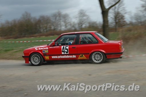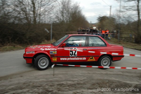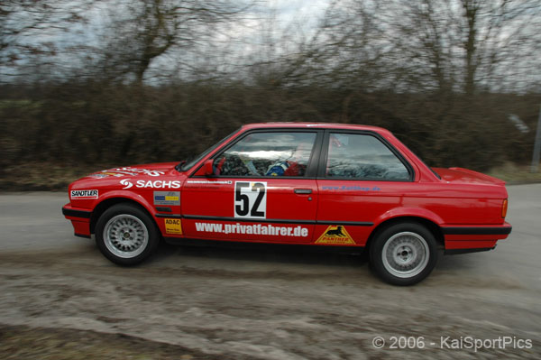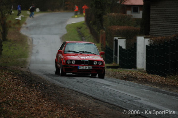 09.04.2006 - Saisonstart bei der Stormarn-Rallye Vorweg: Großes Lob und vielen Dank in Richtung Veranstalter sowie allen Helfern. Aufgrund der zeitweise chaotischen Witterungsbedingungen hatte das Veranstalter-Team bestimmt keinen leichten Job. Danke auch für die schnelle und professionelle Auswertung. Aus unserer Sicht: Wir gingen mit dem roten BMW 318 iS mit Startnummer 52 ins Rennen. Bei dieser Rallye sollten neun Wertungsprüfungen (WPs) auf Bestzeit gefahren werden. Im Gegensatz zum Vorjahr waren wir diesmal nicht auf den letzten Drücker angereist. So hatten wir dann Zeit, die Reifenkarte in Schönschrift auszufüllen und auch mal die Startnummern am BMW fein säuberlich anzubringen ... . Und ganz wichtig: Wir konnten noch vor dem Start mit vielen netten Leuten schnacken. Das hat schon mal richtig Spaß gemacht und wurde als erster Erfolg des Tages "verbucht". Die WPs machten beim Abfahren einen guten, aber dank des langen Winters nicht den saubersten Eindruck. Vorsicht war also angesagt. Zur ersten WP: Die lief für uns sehr zufriedenstellend. Mit unserem G18/G3-Auto konnten wir zeitgleich mit zwei weiteren Teams unter 55 Startern die 30. Gesamtzeit fahren, was zugleich die 4te Klassenzeit unter 12 Startern bedeutete. In WP2 habe ich mich dann etwas dusselig angestellt, sodaß die Zeit nicht so überragend war - Platz 8. In WP3 wollte ich dann alles besser machen. Allerdings gab es dort wegen eines Unfalls eine ellenlange Startverzögerung. Bis dahin war es trocken gewesen, der Grip war recht gut. Etwa 30 Sekunden vor unserem Start (ich schwöre es) ging dann ein Hagelschauer runter, der die Fahrbahn für mich und die letzten vier Starter hinter uns sehr rutschig werden ließ. Die Zeit war dann natürlich auch dahin. Wie heißt es so schön: Lerne Dinge hinzunehmen, die man nicht ändern kann ... . Den Rest sind die Teams mit den hohen Startnummern dann nur noch bei Nässe gefahren. Bei starkem Regen war unser Auto mit den neuen Racing-Reifen nur sehr schwer auf der Straße zu halten, auf nur feuchter Fahrbahn funktionierte das Auto aber ganz gut. In WP 8 sind wir zeitgleich mit vier weiteren Teams noch die 19te Gesamtzeit gefahren - darauf bin ich sehr stolz. Ergebnis nach 9 Wertungsprüfungen: Klassenrang 6 unter 12 Startern Danke noch an Björn, es war ein sehr schöner (und ziemlich anstrengender) Tag.