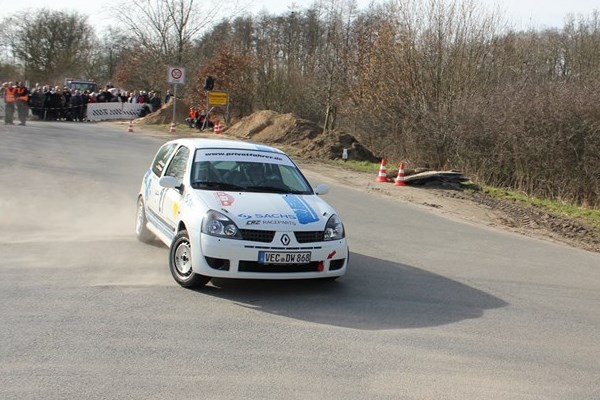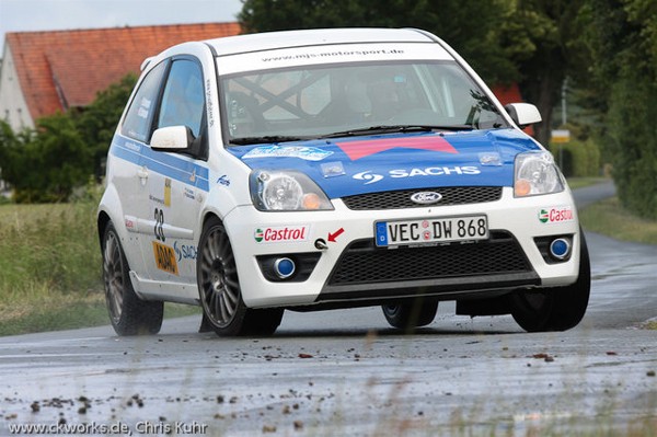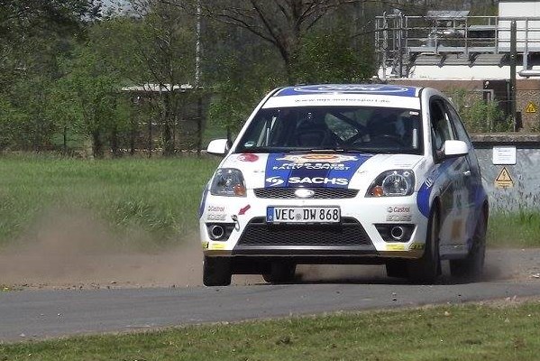 Zum Nachmittags-Slalom: Diesmal durfte ich keinen Pokal mit nach Hause nehmen. Ich fuhr auf Platz 4 unter 8 Startern. Das war ok, haute mich allerdings auch nicht um. Bei Felix wollten wieder nicht alle Hütchen stehen bleiben, aber das ist in diesem Sport halt manchmal so. Übrigens fuhren wir mit alten Toyo Proxes R888 Sportreifen. Das war nicht optimal, der Fiesta XR2 war nicht allzu präzise zu fahren. Mit diesen Reifen sind allerdings die Lenkkräfte nicht so hoch, was Felix etwas entgegen kommt. Weiter geht´s am kommenden Wochenende mit der Rallye Stemweder Berg im Ford Fiesta ST. 09.05.2012 - 25. ADAC Mobil Pegasus Rallye Sulinger Land Ein kurzer Bericht zu unserem Start am 04./05. Mai in Sulingen, einem Lauf zum ADAC Rallye Masters sowie auch zur Niederländischen Rallye-Meisterschaft. Wir sind recht zufrieden mit unserer Rallye, denn wir sind ohne Schäden am Rallye-Auto durchgekommen und haben in der Division 5 unter 15 Startern am Ende Platz 7 belegt. Im Gesamtklassement belegten wir Platz 63 unter 119 Startern. Da wir ohne Service gefahren sind, wollten wir nur durchkommen und nichts kaputt machen. Lediglich auf WP5, dem zweiten Durchgang auf dem IVG-Gelände, wollte ich glänzen. Das klappte dann eigentlich sehr gut und wir waren ziemlich zügig unterwegs. Naja, bis wir in der fünftletzten Kurve in einer links drei von der Strecke abkamen und im Gebüsch festhingen. Bis wir mit Hilfe eines Streckenpostens und Felix' Muskelkraft wieder frei kamen, vergingen 1 1/2 (oder mehr) Minuten. Grrr ... . Zusammenfassend hat uns die Rallye viel Spass gemacht. Der Aufwand war recht groß, wir waren zwei komplette Tage unterwegs. Aber es war eine tolle Gelegenheit, auch mal ein wenig internationale Rallyeluft zu schnuppern. Neben den deutschen Teilnehmern waren auch Teams aus den Niederlanden, aus Dänemark, Slowenien, Finnland, Schweden und Großbritannien am Start. Die Veranstaltung war absolut top organisiert, alles vom Feinsten. Danke an die MSG Sulinger Land und an alle Helfer! Felix erledigte seinen Job als Co-Pilot wieder einmal sehr gut und arbeitete gewohnt fehlerfrei. Der ist schon cool, er liest selbst bei den wildesten Sprüngen und hohen Geschwindigkeiten auf engsten Wegen ruhig weiter. Bravo, Felix!