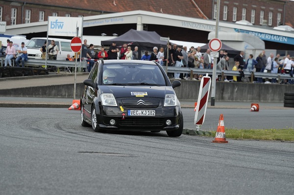 Grundsätzlich ist der Wagen für die 2012er Strecken dieser Rallye aber deutlich untermotorisiert. Mit etwas mehr Power tut man sich sicherlich leichter. Das Fahren machte Spaß, aber richtig toll fand ich es dieses Jahr in und um Stemwede nicht. So wurde gleich zweimal von einem und denselben Starter nur ein paar Sekunden nach Beendigung unserer ersten Runde ein richtig schnelles Auto auf die Reise geschickt. Das kann einmal passieren. Allerdings kein zweites Mal, wenn man vor dem zweiten Durchgang den Starter höflich bittet, etwas Umsicht zu zeigen. Es ist einfach saugefährlich, wenn man auf solch schnellen Prüfungen einen anderen vorbeilassen muß. Zweimal mußte ich deshalb rechts ran fahren, obwohl dafür eigentlich kein Platz war. Aber wenn man meint, das muß so sein, dann das nächste Mal eben ohne uns. Ansonsten waren alle Helfer oder sonstwie Beteiligte sehr nett und aufgeschlossen. Mit einigen Kollegen gab es auch noch interessante und / oder lustige Gespräche. Der Wagen hat keinen einzigen Kratzer abbekommen. Alles ok. Danke noch an Felix, so langsam entwickelt er sich noch zu einem Weltklasse-Co. Davon sollte sich der Fahrer mal eine Scheibe abschneiden ... . Ein schönes Video gibt es bei Helmut Solke - Rallyefilme-Nord.de oder auch bei Youtube: http://www.youtube.com/watch?feature=player_embedded&v=tEiPZpsBQHA 11.06.2012 - Clubsportslalom Sportfahrerclub Bremerhaven Zum gestrigen Slalomdoppel im Fischereihafen Bremerhaven: Nach dem Einsatz als Copilot bei der Rallye Sulinger Land wollte Felix gerne mal wieder selbst fahren. Letztmals durfte er am Ostermontag das Lenkrad drehen. Also machten wir uns gestern auf den Weg nach Bremerhaven, wo vormittags und nachmittags jeweils eine Clubsport-Slalomveranstaltung stattfinden sollte. Die geplanten Veranstaltungen im nahen Ahlhorn wurden ja leider abgesagt. Für Felix bedeutete das ein extrem frühes Aufstehen, da er vorher noch seinen Job als Zeitungsbote zu erledigen hatte. In Bremerhaven angekommen, wartete auf uns die übliche Abnahme von Dokumenten und Fahrzeug. Diese Hürde war schnell erklommen, die Wartezeit bis zum Start vertrieben wir uns mit ein paar Gesprächen mit den Kollegen und Zuschauen. Zum Vormittags-Slalom: Felix kam im Probelauf sofort auf eine sehr gute Zeit, er war rund 3 Sekunden schneller als ich und entsprechend happy. In den beiden Wertungsläufen hab ich dann noch ein paar Kohlen nachgelegt, sodaß ich am Ende Platz 3 unter 9 Teilnehmern in der Klasse 3a belegte. Dafür gab es einen schönen Pokal und ich war zufrieden. Felix' Fahrzeit war zwar etwas besser als meine, allerdings hatte er einige Pylonen getroffen, wofür es satte Strafsekunden gab. Mit seinem Speed darf er dennoch zufrieden sein, den Rest macht dann die Erfahrung.