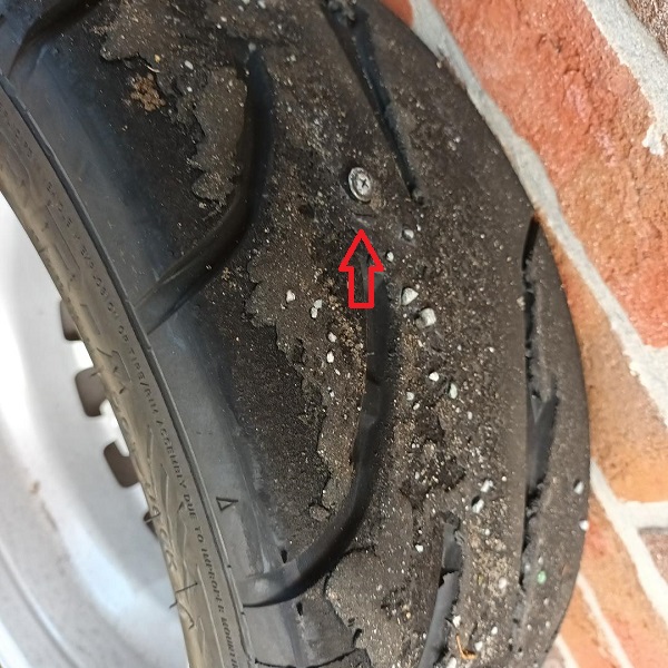 die beschädigte Felge. Den Kotflügel habe ich ausgebeult,