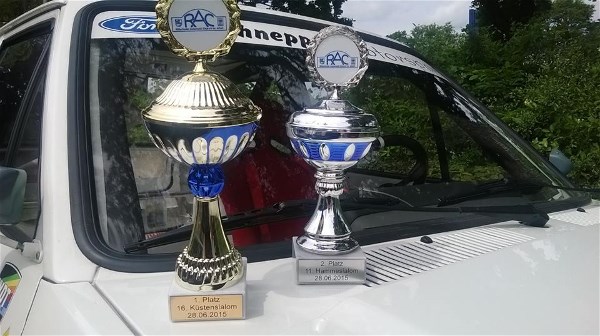 04.07.2012 - Slalomdoppel Ritterhuder AC Hier nun ein kurzer Rennbericht zum letzten Wochenende. Felix und ich waren diesmal nach Osterholz-Scharmbeck gefahren, um dort vormittags am 8. Hammeslalom sowie nachmittags am 13. Küstenslalom teilzunehmen. Nach sehr kurzer Nacht mit nur zwei Stunden Schlaf - gut 20 Meter hinter dem Schlafzimmerfenster wurde gefeiert - ging es am Sonntagmorgen mit dem alten XR2 auf die Autobahn. Auf dem Slalomgelände angekommen, war ich mangels echter Nachtruhe und anstrengendem Vortag komplett neben der Spur. Felix, der den ganzen Samstag im Zimmer wegen einer abzugebenen Facharbeit verbringen durfte und am frühen Sonntagmorgen vorab noch seinen Job als Zeitungsverteiler zu erledigen hatte, war dann doch deutlich fitter. Nun, er ist auch noch ein paar Jahrzehnte jünger. Ich jedenfalls brachte es fertig, mich im Probelauf zum Hammeslalom zu verfahren - ich konnte mich einfach nicht konzentrieren. In den Wertungsläufen riss ich mich etwas mehr zusammen, leider fielen dann aber 3 Pylonen um, die 9 Strafsekunden brachte. Mit Platz 5 unter 11 Startern in der Klasse 3a war ich noch ziemlich gut bedient. In der Pause fuhren wir dann zu McDonalds, um uns zu stärken. Was ganz gut klappte. Dank McD-Tuning war ich vor der Nachmittagsveranstaltung deutlich fitter, die starke Müdigkeit war weitestgehend weg, Kampfgeist und Zuversicht dafür wieder da. Sofort purzelten die Zeiten, ich war deutlich schneller als am Vormittag. Unter 10 Teilnehmern in der 3a hätten die Fahrzeiten diesmal für Platz 2 gereicht. Mit einem geschmissenen Hütchen und den daraus resultierenden 3 Strafsec. gab es letztendlich einen schönen Pokal für den wohlverdienten dritten Platz. Trotz nicht ganz fehlerfreier (aber sehr aggresiver) Fahrt war ich zufrieden. Die wegen Umbauarbeiten verkürzte Strecke gefiel mir gut, der Parcours hatte seinen Reiz. Sehr gut gefallen haben mir auch wieder die Gespräche mit den Kollegen und dem Veranstalter. Da sind schon echt nette Jungs dabei, wir kommen gerne wieder. Zu Felix: Der Sohnemann konnte mich erstmals schlagen. Vormittags bekam er einen Pokal für einen starken vierten Platz unter 11 Teilnehmern in der Klasse 3a. Er lernt schnell dazu, er ist - das möchte ich nochmal erwähnen - erst 17. Am Fiesta war diesmal eine Auspuffhalterung gerissen, was für einen Höllenlärm im Auto sorgte, da ein Flachstahl immer wieder an den Fahrzeugboden klopfte und auf dem Pflastersteinen schliff. Den Schaden habe ich gestern aber behoben, der Fiesta wartet bereits auf den nächsten Einsatz. 17.06.2012 - 42. ADAC-Rallye Stemweder Berg Ein paar Zeilen zur Rallye Stemweder Berg, die wir gestern gefahren sind. Vorweg: Wir sind ins Ziel gekommen, haben in der Division 5 unter 8 Startern Platz 4 belegt, im Gesamtklassement sprang bei 46 Teams Platz 28 heraus. Das Resultat war besser, als wir erwartet hatten - richtig schnell waren wir allerdings nicht. Denn wir waren mal wieder mit minimalen Aufwand unterwegs. Einen Service hatten wir nicht, später kam aber Kumpel Thomas dazu und putzte für uns freundlicherweise die Scheiben. Wir sollten wenigstens den Durchblick behalten ... . Am Samstag goß es vor dem Start in Strömen. Das stört mich eigentlich überhaupt nicht, ich fahre gerne im Regen. Das Problem war, daß wir keine Regenreifen für den ST besitzen. Also fuhren wir vorne mit uralten und schon ziemlich abgefahrenen Trockenreifen los, hinten hatten wir aber recht brauchbare, wenn auch schon alte Intermediates drauf. Die ersten drei Prüfungen im Nassen waren für uns der totale Eiertanz, in den Pfützen hatten wir mit mächtig Aquaplaning zu kämpfen. Die Vernunft riet zu langsamer Fahrweise und dann klappte es mit den WPs auch ganz gut. In WP4 war es bereits weitestgehend trocken und wir konnten etwas flotter fahren. Einmal mußte ich allerdings "unbedingt" in einen kleinen Graben fahren, aus dem wir merkwürdigerweise dank großem Schwung auch gleich wieder raus kamen. Uiuiui ... .