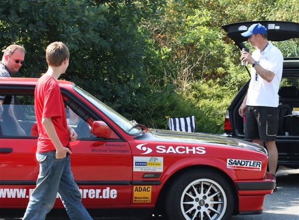 Im anschließenden Service wartete bereits Kumpel Björn auf uns. Er war bereit für Heldentaten, aber am Auto musste nichts gemacht werden. Kurz ins Brötchen gebissen, einen Schluck aus der Colaflasche genommen und weiter ging's. Durch die weiteren Prüfungen kamen wir auch recht gut. Am Nachmittag wurde leider wieder eine Prüfung abgebrochen. Im Rundkurs auf der Südschleife bin ich zweimal rechts ran gefahren, um stärkere Autos vorbeizulassen. Das hat ordentlich Zeit gekostet. Auch hatte ich in der dritten Runde einige Ecken lang keine Bremsen, sie waren schlicht überhitzt. Die letzten vier WPs bei Dunkelheit drehte Felix wieder am Lenkrad. Er machte das sehr gut. Der von mir auf der Haube installierte LED-Leuchtbalken funktionierte bestens, bei Dunkelheit machten wir noch richtig Positionen gut. Übrigens ist Felix mittlerweile ein echter Allrounder. Gefahren ist er mittlerweile bereits Clubslalom, DMSB-Slalom, Rallye, Rallyesprint, Bergrennen und Rundstrecke. Bei mir fehlt die Rundstrecke. Gegen 20:00 Uhr erreichten wir dann das Ziel. An der Zielrampe wartete unser Slalomfreund Sebastian Musow samt Kumpel auf uns. Das war sehr nett. Auch bekamen wir Besuch von unseren Freunden Christian und Frank. Wir haben uns sehr gefreut. Alles in allem waren das wieder viele schöne Erlebnisse. Das war eine tolle Veranstaltung. Felix und ich sind happy. Danke an alle, die dazu beigetragen haben.