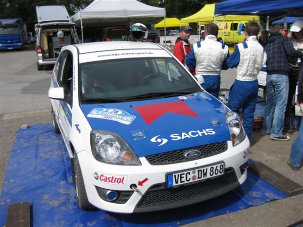 13.04.2009 - Osterslalom Lohne Das war heute ein richtig schöner Tag. Bei Traumwetter lief heute der Osterslalom des AMC Lohne, gleichzeitig erster Wertungslauf zum Nordwestdeutschen Slalom Cup. Ich hatte mich relativ kurzfristig dazu entschieden, mit dem Fiesta XR2 in der Klasse 3a zu starten. Das Auto - seit neun Jahren in meinem Besitz - hatte ich nun schon ein Jahr lang nicht mehr bewegt. So habe ich den Wagen über Ostern zunächst wieder zum Leben erweckt. Erstmals bin ich auch mit den Michelin-Rundstreckenslicks gefahren, die ich vor zwei Jahren gebraucht günstig erstanden hatte. Die Reifen haben übrigens gut funktioniert, der Fiesta fühlte sich damit längst nicht so nervös wie sonst an. Die relativ hohen Flanken federn anscheinend gut mit. Das scheint der Ford zu gebrauchen. Das Fahren an sich war fast nebensächlich. Es gab sooo viele nette Gespräche mit Freunden und Bekannten, was mir super gefallen hat. Die Stimmung war klasse. Der AMC Lohne hatte einen - so meine ich - schönen Parcours aufgebaut. Mir hat er gefallen. Im Trainingslauf mußte ich mich noch an den Fiesta und die neuen Reifen gewöhnen. Am ersten Tor nach dem Start bin ich glatt vorbei gefahren, da kaum Bremswirkung vorhanden war. Bremsklötze und Scheiben mußten sich anscheinend erst noch nach der langen Pause ans Bremsen gewöhnen ... . Im ersten Wertungslauf funktionierte die Mechanik schon ganz gut, ich war aber ein wenig zu vorsichtig unterwegs. In Lauf zwei konnte ich mich um über zwei Sekunden verbessern, mit den gefahrenen 1:05 Minuten war ich zufrieden. Besser unterwegs waren an diesem Tag allerdings Wilfried Böhmann und Heinz Jabs, die sich verdient vor mir platzieren konnten. So blieb Platz 3 unter vier Teilnehmern in der Klasse sowie im Gesamtklassement Platz 11 bei 41 Startern. Spaß hatten auch Felix und Tim, die mich begleiteten. 02.04.2009 - Historie des Fiesta ST Nachfolgend ein paar Bilder und Infos zu den bisherigen Einsätzen des neuen Autos. Erstmals im Rallyesport eingesetzt wurde der Wagen in der Saison 2006. Der N3-Fiesta hat zweimal die Deutschland-Rallye bestritten, 2007 fuhr der junge Mark Wallenwein damit den deutschen Weltmeisterschaftslauf.