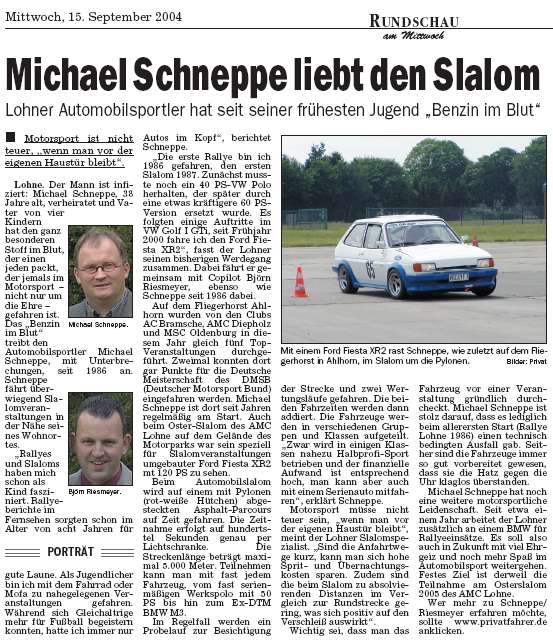 läßt. 28.01.2005 - Nachtrag Am 15. September 2004 zeigte die "Rundschau am Mittwoch" in einer Auflage von 46.000 Exemplaren einen Bericht zu den motorsportlichen Aktivitäten des Duos Schneppe / Riesmeyer. Für Interessierte der Bericht nun als Datei.